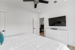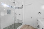 - Master Bedroom 2: King bed, shared bathroom with double vanities and large glass shower, and private porch access