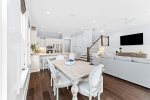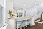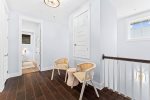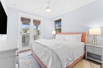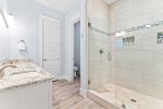 The primary bedroom is located on the first floor, with a big walk-in closet and a luxurious bathroom featuring a large walk-in shower with both handheld and rainhead options. Upstairs, you’ll find a spacious bedroom with a walk-in closet and its own bathroom. Two additional bedrooms are located on the second floor at the front of the house and open onto a balcony, perfect for enjoying sunsets and fresh air. These bedrooms share a gorgeous hall bathroom with a double vanity.