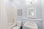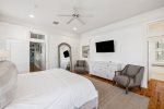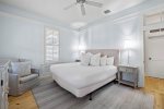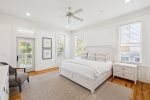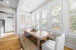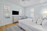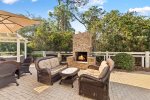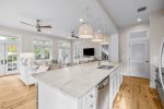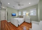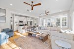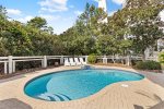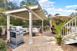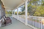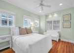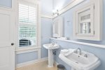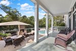 This home has an open floor plan with plenty of separate (or combined) spaces for all ages to spread out comfortably. The home has a large dining area with doors that open to the outside, a private pool flanked by an outdoor fireplace, a separate carriage house with access to the pool area, a half bath for ease of use from the pool, and more! The main house has 4 bedrooms and 4 full bathrooms which includes 3 king bedrooms, two of which open on to the spacious wrap-around porches. The main upstairs master's balcony is private and overlooks the pool area. The additional bedroom upstairs also has a built-in queen over queen size bunk bed with a queen trundle pullout (sleeps 6 guests). The carriage house has 1 queen bedroom and a twin-size sleeper sofa, another full bathroom, and its own living area and kitchenette.