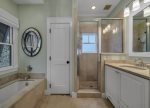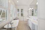 - Master bedroom with king bed + en suite bathroom with double vanities, shower and separate claw foot soaking tub + private balcony access overlooking pool