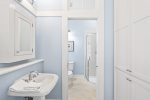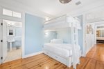 - Bunk room with built-in queen over queen size bunk beds with queen trundle pull out + en suite bathroom with double vanities and shower