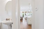 As you step inside, you’ll find a spacious open layout featuring beautiful hardwood floors and stylish furnishings. The bright living area flows into a modern white kitchen equipped with stainless steel GE appliances and marble countertops. The large kitchen island has bar stool seating, making it a great spot for family meals or snacks.