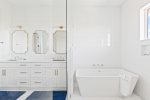 - King master + en suite bathroom with enormous glass shower and separate soaking tub inside the shower and dual vanities + private balcony