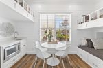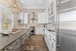 The second floor offers a spacious living room with balcony access, a dining area, and a gorgeous kitchen featuring high-end appliances and custom cabinets. The bedroom on this floor features a Queen-sized sofa bed with a trundle pullout, and shares the second-floor bathroom with a glass shower.