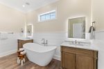 Going up to the third floor, you'll find the final bedroom, featuring a King-sized bed, it's own private balcony, and an en-suite bathroom with dual vanities, a glass shower, and a separate soaking tub.