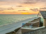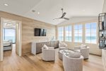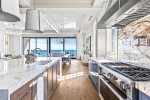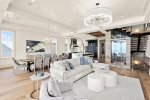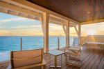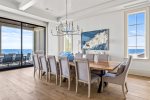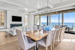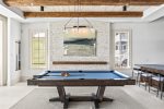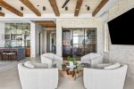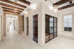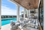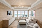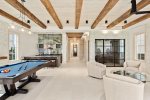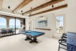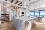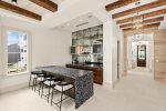 The first floor greets you with Spanish limestone tile flooring that continues out onto the pool deck, 12' ceilings with reclaimed wood beams, and stunning Gulf views. The first floor also has a shiplap-covered bunk room (8 Twin beds each with their own TVs) with en-suite bathroom, a King bedroom with en-suite bathroom, a half bathroom, and a STUNNING entertaining space comprised of a wet bar with waterfall countertop, a suspended glass-encased wine cellar with hand-laid brick floors, and an adjacent living room with pool table and comfortable chairs with 85" TV framed by floor to ceiling glass windows that step out to the private resort-style pool and hot tub with endless views of the Gulf. On the pool deck, there is also a gorgeous built-in outdoor kitchen with huge gas grill, sink and TV above, accented with granite counters and backsplash slabs that go to the ceiling.