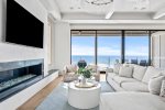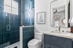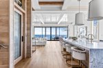 On the fourth floor you will find another beautiful living area with a seating area and TV, built-in wet bar, waterfall countertops, and vaulted ceilings. There is the final King guest suite that opens onto a private balcony and a large bathroom with double sinks and glass shower that also opens onto another private balcony. The views will blow you away!