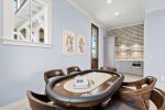 The carriage house has a home theater room with a large leather sectional couch, another built-in wet bar with a full-size refrigerator and microwave, a poker table, another King guest suite with a beautiful en-suite bathroom, and a washer/dryer.