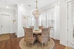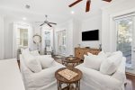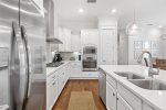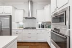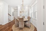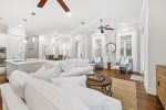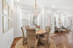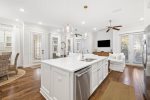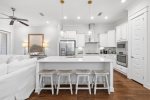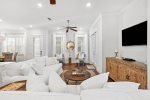 As you enter, you'll find a spacious open layout filled with inviting coastal decor. The comfortable living room features 2 large sets of french doors that look open up to the outdoor patio, creating a bright and airy space. The space flows seamlessly into the dining area and fully equipped kitchen, complete with stunning quartz countertops, modern appliances. and soft-close cabinets—everything you need to prepare meals for your family and friends.