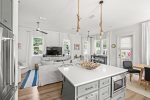 Specifically, the first floor has an open kitchen and living room that features plenty of comfortable seating including an eat-in kitchen island with 3 bar stools, a separate dining area that seats 6, and a convenient powder bathroom. Additionally there is one master bedroom on the first floor with a king bed and also a full private en suite bathroom with shower and access to the private screened-in back porch complete with TV for relaxing for a movie night or the big game!