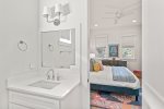 The second floor hosts the primary master bedroom suite, featuring a king bed and a private en suite bathroom with glass shower and double vanities, and also has access to another private screened in porch. There is also a kid-friendly bunk room with two twin beds and one queen bed which uses the corresponding hall bathroom along with the fourth bedroom with queen bed.