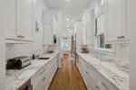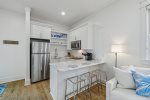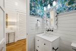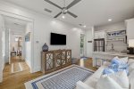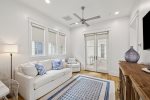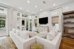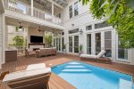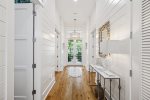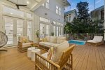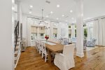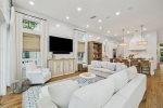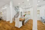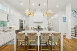 This spacious home has a very open-concept floor plan with plenty of space for all ages to spread out comfortably. The home boasts marble counter tops throughout, a massive breakfast bar with seating and eat-in kitchen, adjoining butler's pantry, a spacious dining area with doors that open to the outside, a separate sitting room off the entry, a private heated pool flanked by a stunning outdoor fireplace and large TV, a separate carriage house, and more! The main house has 6 bedrooms and 6.5 baths, which includes 2 spacious primary suites- one of which has its own private balcony overlooking 30A. Two of the bedrooms have bunk beds (one with 4 Twins and one with 4 Queens) which are great for families with plenty of kids. The third floor has a TV and game area that includes a ping pong table and Queen-size sleeper sofa. The carriage house has 1 Queen bedroom and another full bathroom, and its own living area with a Queen-size sleeper sofa, kitchen, and laundry.