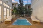 - Bedroom 3 (Master): King bed + en-suite bathroom with massive glass shower and separate soaking tub + porch access overlooking deck and pool