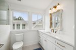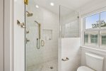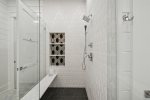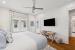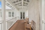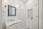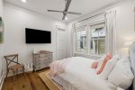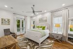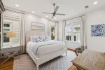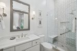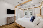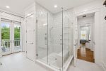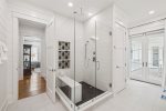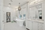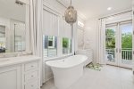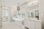 - Bedroom 2 (Master): King bed + en-suite bathroom with massive glass shower and separate soaking tub + private second-floor porch access facing 30A