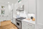 The spacious house boasts an incredible brand new kitchen, a carriage house with full kitchen (5 king beds total), and wonderful outdoor spaces including an outdoor dining space, outdoor fireplace + kitchen w string lights, and front porch with seating perfect for a cocktail!