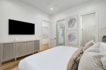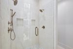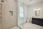 - Bedroom 1 with king bed + en suite bathroom with large glass shower + soaking tub