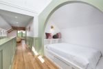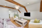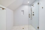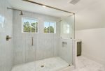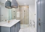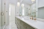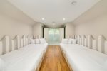 - Bedroom 6 with two sets of two beds (twin next to twin and full next to full) and another full size bed + en suite bathroom with double vanities and large glass shower (sleeps 8)