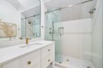 - Bedroom 2 with king bed + en suite bathroom with large glass shower