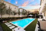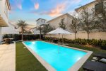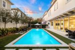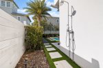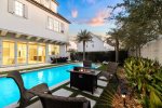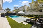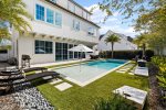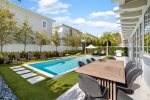 The fully fenced pool area has a chic vibe, with an oversize sun shelf, fire table, outdoor dining table, corn hole, and green space, making it feel like you're at an upscale resort lounging poolside! There's also an outdoor shower, perfect for rinsing off after a day at the beach!
