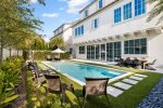 As you enter you will be greeted by a beautifully appointed Alys Beach-vibe, with quartz counters, high ceilings, and wide plank wood floors throughout. The first floor is a wonderful space for entertaining and gathering together, with a massive open-concept floor plan and outdoor living space.