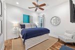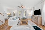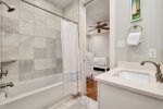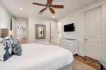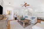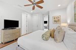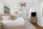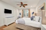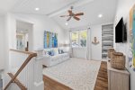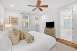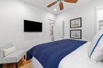 Additionally, there is an office nook, a half bath, and the first floor master king bedroom with en-suite bathroom located just down the hall. This bedroom features a king bed, flat screen TV, and ceiling fan. The en-suite bathroom has double vanities and a glass shower.