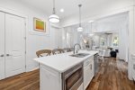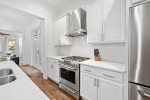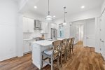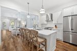 As you enter through the front porch, you're welcomed by a comfortable living room sofa and chairs. The gourmet chef's kitchen features stainless steel appliances, a gas range, and eat-in island seating with bar stools to accommodate 4.