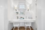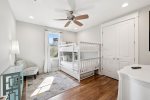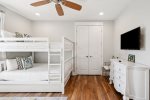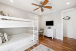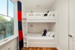 The third guest room upstairs houses a king size bed and en-suite bathroom with glass shower. The fourth guest room has one Full-over-Full bunk bed with a Twin trundle, and shares the hall bathroom with the other bunk room. The fifth guest room has two custom-built twin bunk beds, a TV with DVD player/DVDs provided, and shares the hall bathroom. This bathroom has a shower/tub combination.