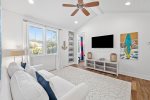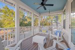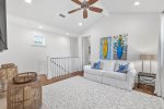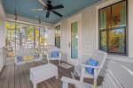 As you advance to the second floor, you'll find four additional bedrooms and a second living space (complete with queen sleeper sofa) - great for kids! The master bedroom upstairs features a king size bed and en-suite bathroom with double vanities, large soaking tub, glass shower and private porch. This second floor balcony porch offers a porch swing and rocking chairs.