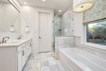 - Master Bedroom 2: King bed, private en-suite bathroom with large soaking tub and separate glass shower, private porch access