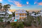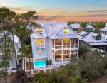 This luxurious coastal home features a spacious, 2 story screened-in porch with a fireplace, private heated pool, + its own private carriage house with a bedroom, full bath, living room, full kitchen, W/D & balcony! It also comes with an arcade machine, built-in projector in the home theater, and inclusive access to the WaterColor amenities!