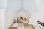 Traveling up to the third floor, there is an open concept room with multiple couches, 4 twin beds, a theater room, and an ARCADE game machine!