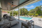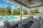 Step outside to a fully fenced yard featuring a beautifully landscaped lawn and private pool, perfect for kids to play. Three sets of doors connect the indoor and outdoor spaces, leading to a spacious covered porch that runs the length of the home. This outdoor oasis includes a BBQ grill, outdoor dining table, corn hole, and plenty of room for poolside lounging!