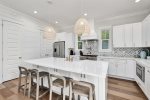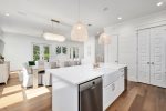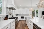 The open kitchen is perfect for gathering, with a large island, custom cabinets, a six-burner stove, quartz countertops, and a stylish gray-and-white backsplash. High-end appliances and a spacious walk-in pantry make cooking and storage easy. Also on the first floor, there is a master suite featuring a King bed and an en-suite bathroom with a walk-in shower, a convenient half bathroom, plus an additional full bathroom with a door to the front yard.