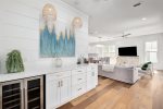 As you walk inside, bright white shiplap walls and hardwood floors create a clean, coastal feel. The first floor features TWO living rooms— one cozy and perfect for movie nights, and one larger space that flows into the dining area and kitchen. Between the two, you’ll find a convenient bar area, perfect for entertaining. Both living spaces open directly to the pool area, making indoor-outdoor living a breeze.