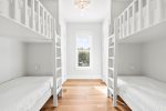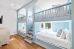 Upstairs, there is an additional master suite, featuring a King bed and en-suite bathroom with a walk-in shower and soaking tub. There are two more King bedrooms located on this floor, along with two bunk rooms! The first bunk room has two sets of Queen-over-Queen bunks, and the other has two sets of Twin-over-Twin bunks. All rooms are equipped with smart TVs for entertainment.