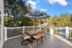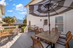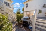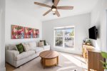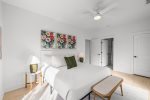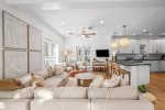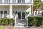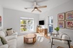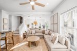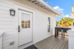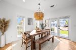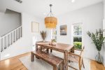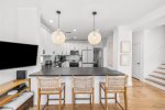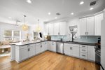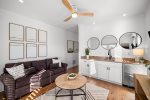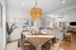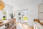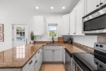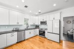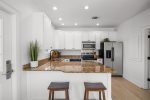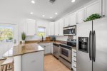 As you enter the main house, you’ll be greeted by a welcoming front porch leading into a bright and open living, dining, and kitchen area. The large kitchen features new cabinets, granite countertops, and stainless steel appliances, perfect for preparing meals after a day at the beach! There is seating for three at the island, with room for more at the dining room table!