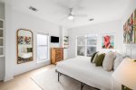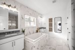 Up on the second floor, the spacious King master suite offers a private balcony, a luxurious en-suite bath with dual vanities, a large glass shower, a separate soaking tub, and a walk-in closet. Also on this floor is another King bedroom, a bunk room with one set of Queen-over-Queen bunks plus a Queen daybed, and a hallway bathroom with a shower/tub combination that these two rooms share.