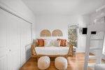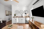 The carriage house, with its own full kitchen and living room, offers a great space for additional guests or family. The first floor of the carriage house features a fun game room with a ping pong table, foosball table, and a large flat-screen TV. There's also a full bathroom and a wet bar for convenience. Upstairs, there is a separate living room with a Queen sleeper sofa, a full kitchen, plus a King bedroom with an en-suite bathroom with a shower/tub combination.