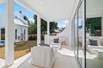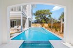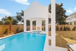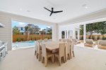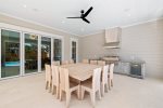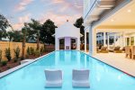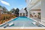 From the game room, step out onto the back patio, where the private pool and hot tub are located! There are two built-in sun loungers in the water, and the hot tub is shaded! On the patio, you'll find an additional 4 sun loungers, cozy sitting area, and a HUGE outdoor dining table- sits 12!