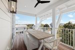The third floor is the star of the show, featuring the chef's kitchen with high-end stainless steel appliances, dining room, and living room with a HUGE couch and two sets of French doors that lead you out onto the balcony with a nice outdoor dining table! Also on the third floor, is the second Master bedroom with a King bed, access to two different balconies, and an en-suite bathroom with dual vanities, large glass shower, and separate soaking tub.