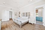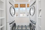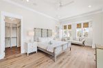 Going up to the second floor, you'll find a second laundry room with two washer/dryer sets, plus 6 additional bedrooms! The first of these bedrooms is the luxurious Master, featuring a King bed, walk-in closet, balcony access, and an en-suite bathroom with dual vanities, a glass shower, and a separate soaking tub. All of the other bedrooms on this floor, except one, also have King beds and en-suite bathrooms. Two of these King rooms also have balcony access. The last bedroom on this floor is another Bunk Room with two sets of Twin XL-over-Twin XL bunks, and an adjacent full bathroom with glass shower.