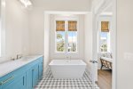 - Bedroom 2: Master with King bed, en-suite bathroom with dual vanities, glass shower, and separate soaking tub, + balcony access