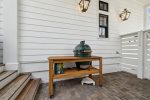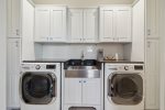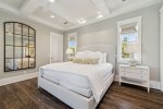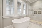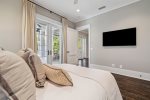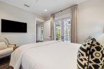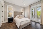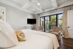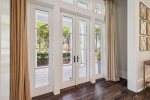 On the second floor, you’ll find another living area, a laundry room, and three bedrooms. The master bedroom features a King bed, balcony access (and access to the carriage house), and a luxurious en-suite bathroom with dual vanities, a soaking tub, and a large glass shower. The other two bedrooms both have Queen beds, en-suite bathrooms with glass showers, and balcony access.