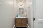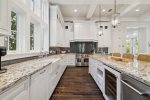 As you enter through the expansive front porch, you’ll find the open-concept living room, dining room, and chef’s kitchen featuring quartz countertops, a Sub-Zero fridge, Wolf double ovens, 8-burner stove, and a large island with seating for four. There's also a half bathroom on this floor for added convenience.