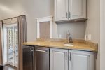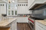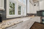 Above the garage and connected to the Master balcony is the carriage house, which includes a media/theater room, kitchenette, desk space, and two sets of built-in Twin-over-Twin bunks with an en-suite bathroom with a shower/tub combination.