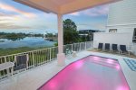 Outside, enjoy the private heated pool, surrounded by comfortable lounge seating, an outdoor TV, BBQ grill, a small dining table, and peaceful lake views. It’s the perfect spot to spend your days in the sun or evenings under the stars.