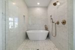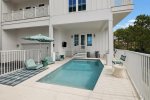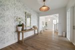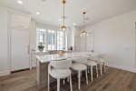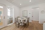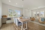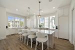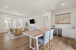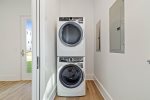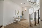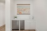 Inside on the first floor, you’ll find a secondary living area with direct access to the outdoor pool deck, and right across is a dining area and kitchenette for poolside snacks and drinks. This floor also includes a half bathroom, a full bathroom with a large glass shower, and one of two laundry rooms.
