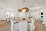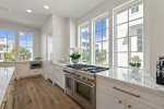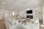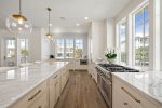 Head up to the second floor to the heart of the home, where the main living area opens up with a cozy fireplace, a round table, and a balcony with stunning Gulf views! The open-concept floor plan leads you right into the dining room with an elegant dining table and a separate balcony with stunning lake views. The kitchen is a chef's dream, featuring a 6-burner stove (with part griddle), dual ovens, and gorgeous waterfall marble countertops.