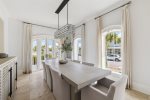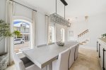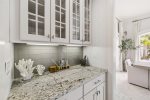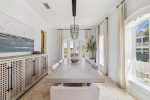 Inside, the first floor has a bright and comfortable living room, along with a charming balcony and a fully equipped kitchen with island seating for 5. Just beyond is the gorgeous dining room, equipped with a table for 8 as well as another small balcony. Also on the first floor, you'll find a stylish mini bar area as well as a half bathroom.