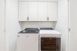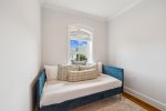 On the second floor, you're immediately greeted by the landing with a cozy Twin daybed. There's also the laundry room as well as two spacious bedrooms on this floor. The first is the master bedroom, featuring a King bed, one private Juliet balcony, one shared balcony, and an en-suite bathroom with dual vanities, a large glass shower, and a separate soaking tub. The second bedroom also has a King bed, two accesses to a shared balcony, and an en-suite bathroom with a glass shower.